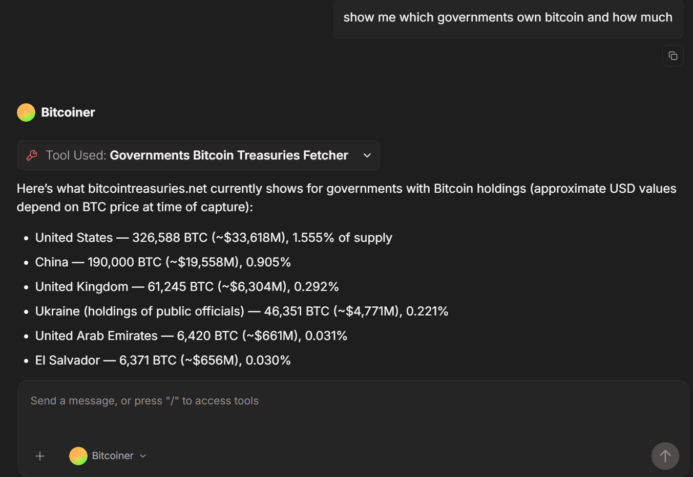 🏛️ Governments BTC Fetcher — track Bitcoin holdings by national treasuries, from the U.S. and China to El Salvador and beyond.