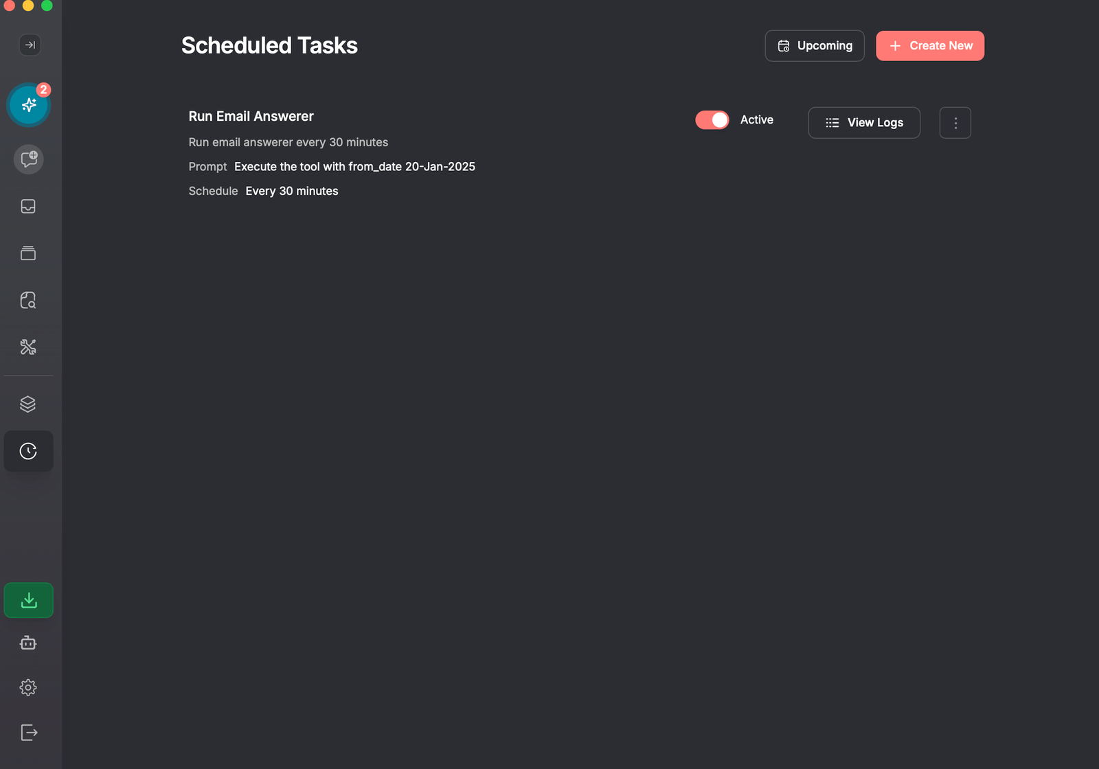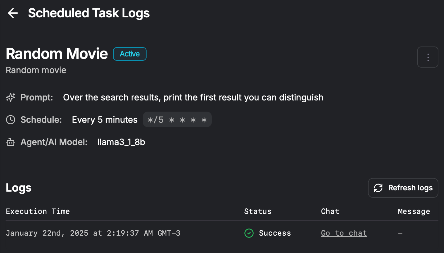 Execution logs for scheduled tasks link directly to chats, allowing you to easily review and analyze the outcomes of each task execution.