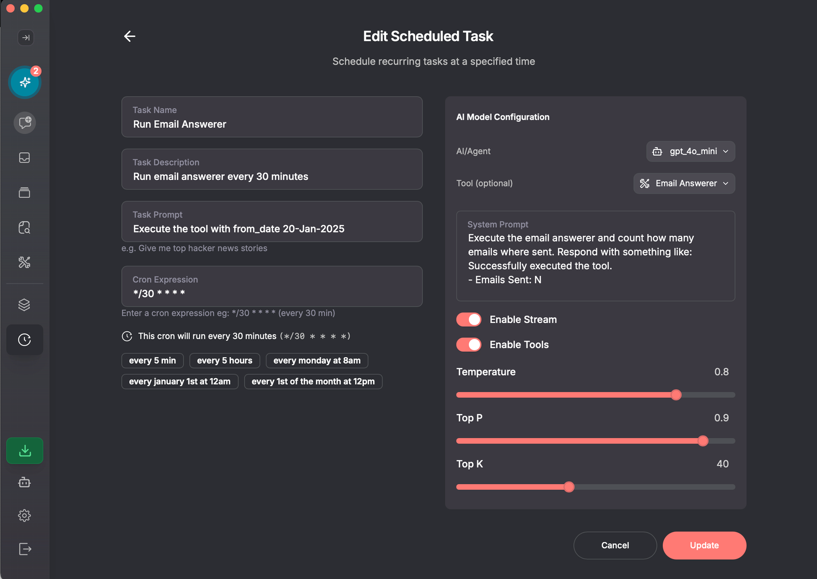- Create a new task, define its schedule using cron notation, and configure the tools it will use.