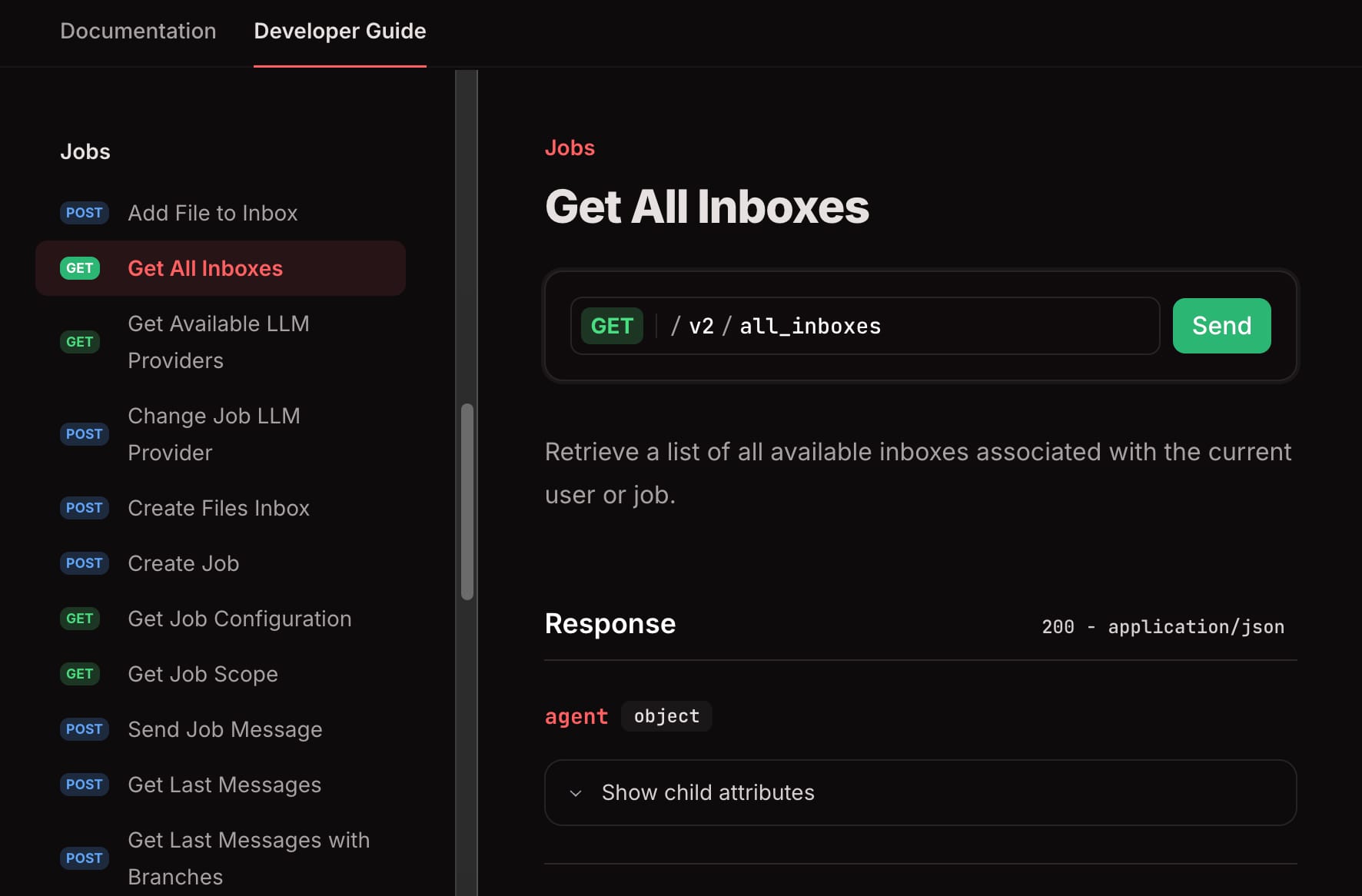 - Clear Endpoint Descriptions: The API documentation provides detailed explanations of key endpoints, making it easy to connect your applications to Shinkai’s AI. Whether you're integrating chat functionality or file processing, each endpoint comes with usage examples, descriptions, and return data types.